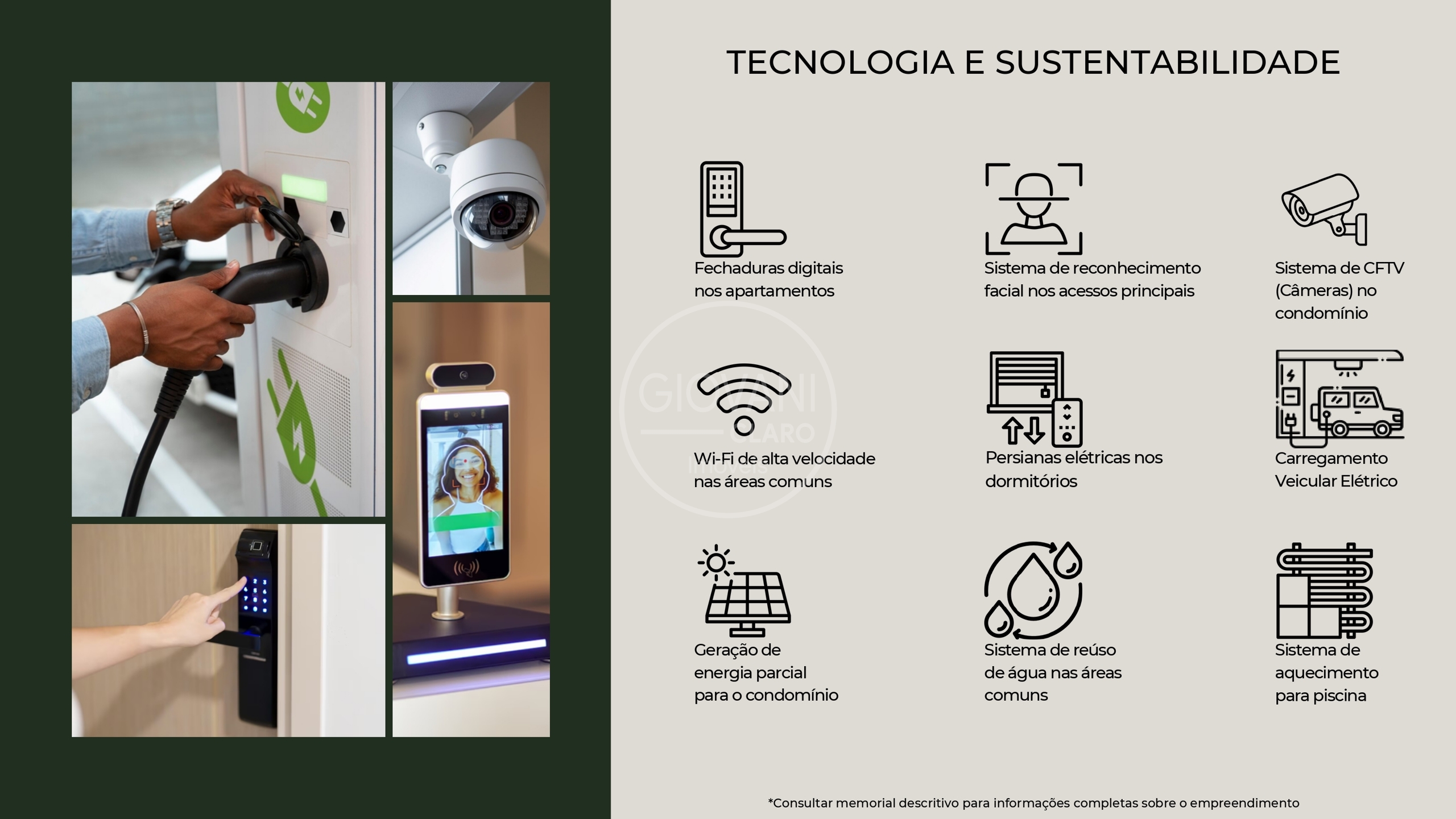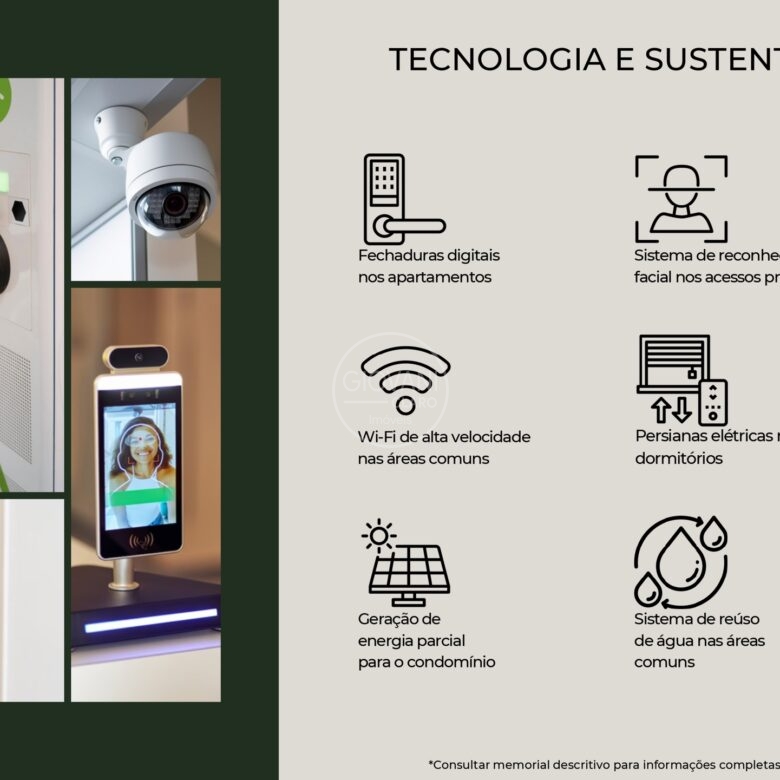 - Tecnologia e Sustentabilidade: Conte com fechaduras digitais, reconhecimento facial nos acessos, carregamento para veículos elétricos e sistema de reúso de água nas áreas comuns .
