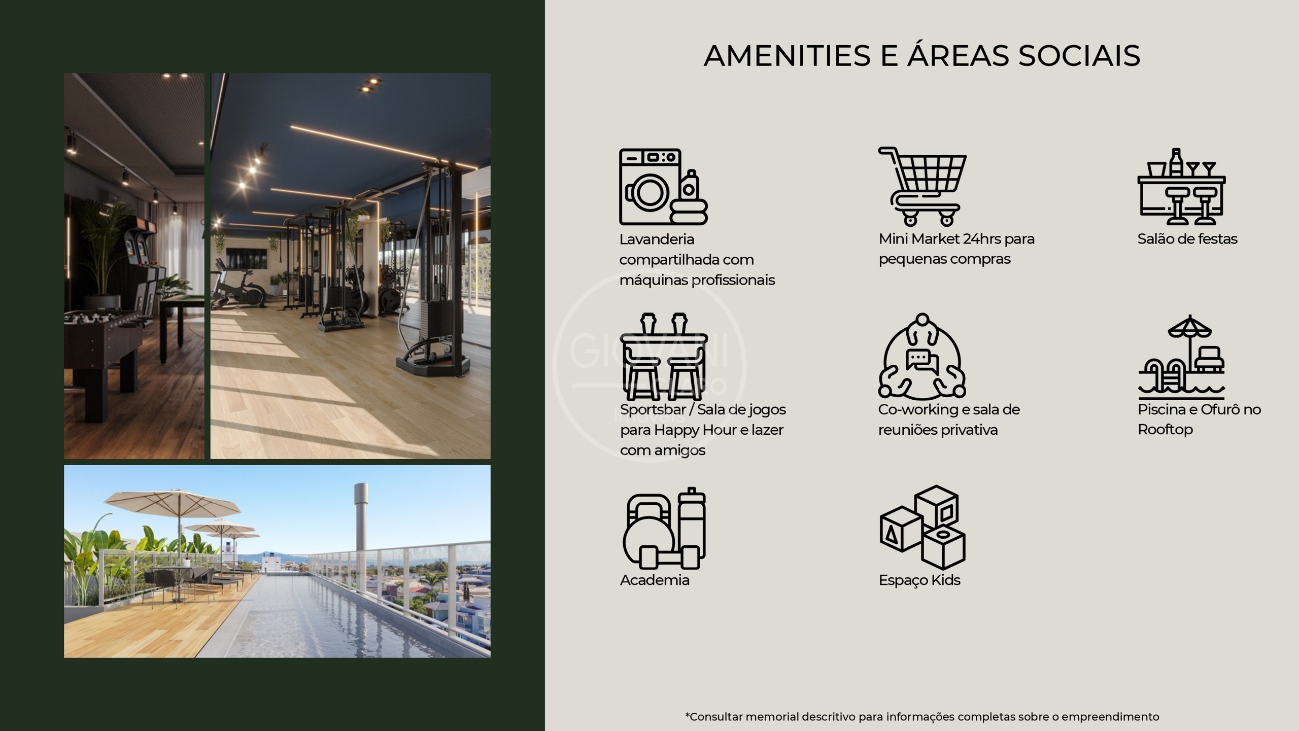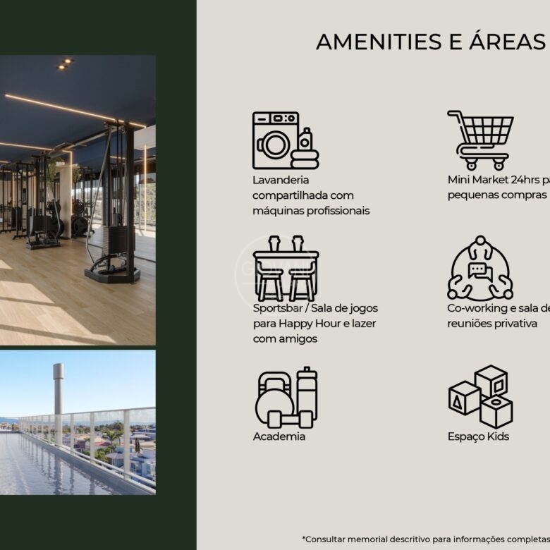 - Lazer e Comodidades: Desfrute de piscina aquecida, academia, salão de festas, espaço kids, coworking, lavanderia compartilhada, mini market 24h e smart lockers para encomendas .