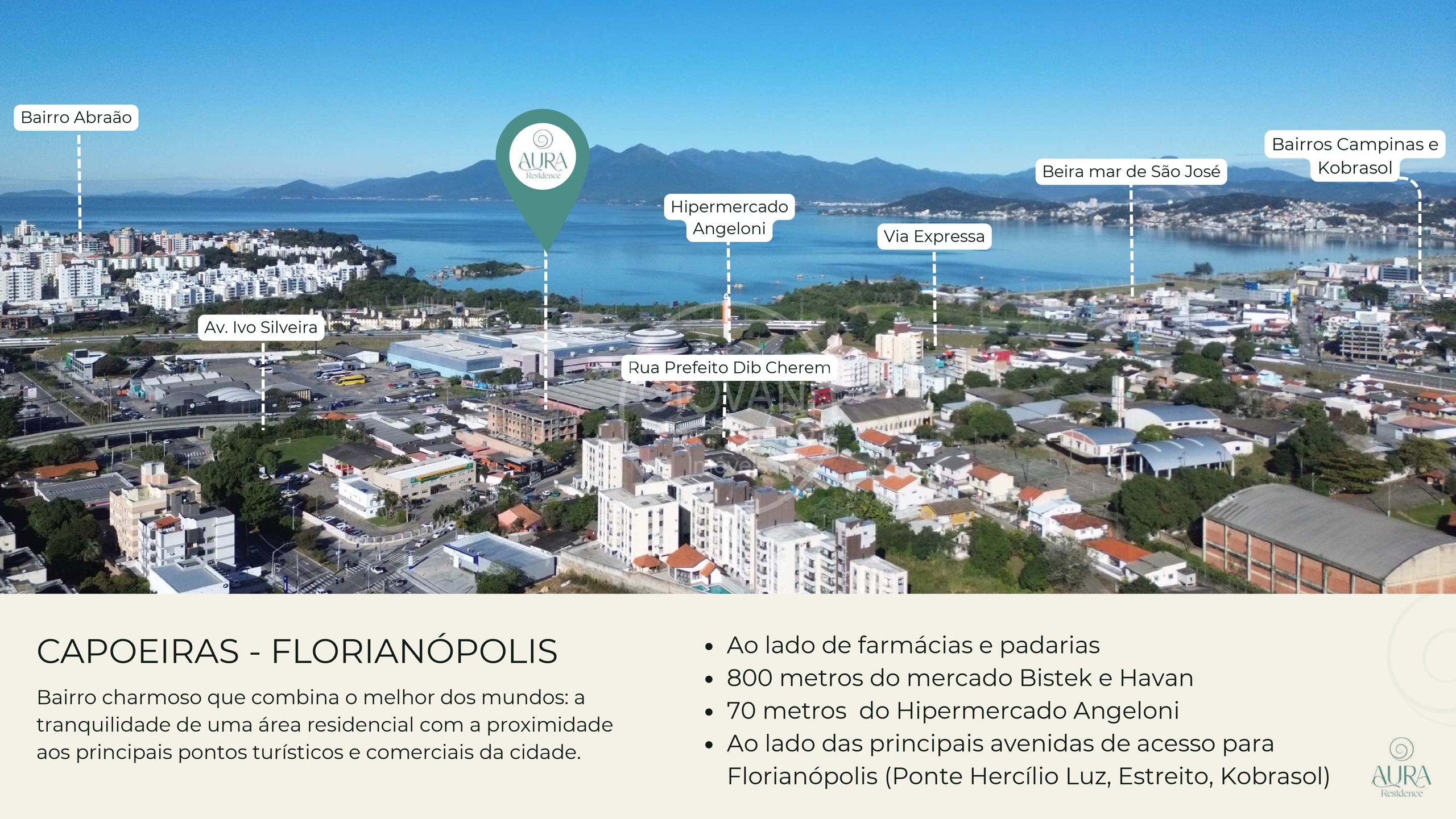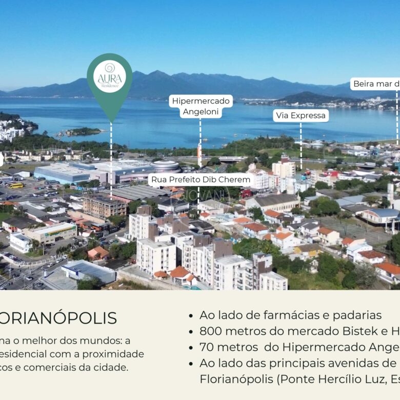 Viver em Capoeiras é ter o melhor de Florianópolis ao seu alcance. O Aura Residence está a poucos minutos do Centro da cidade, da Beira-Mar Continental e de uma vasta rede de comércios e serviços, combinando a tranquilidade de uma vista para o mar com a praticidade urbana.